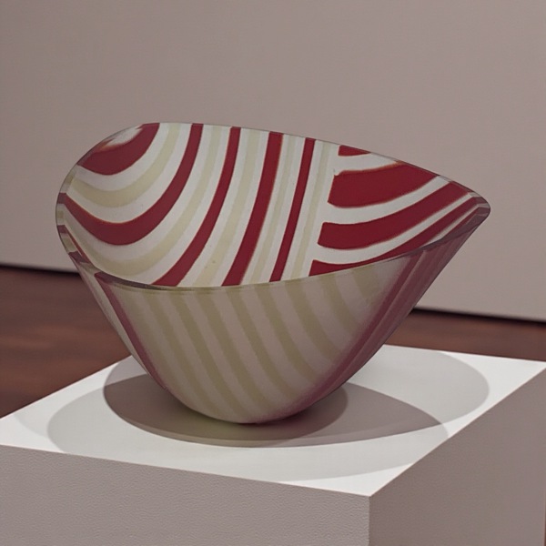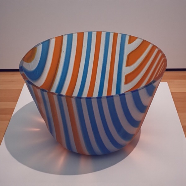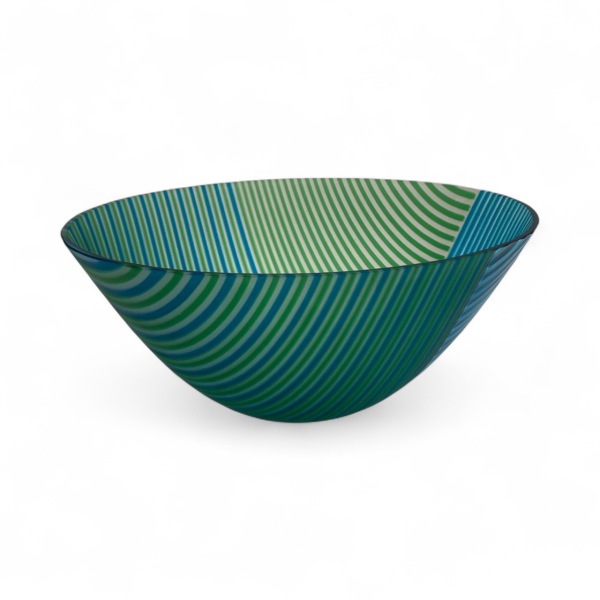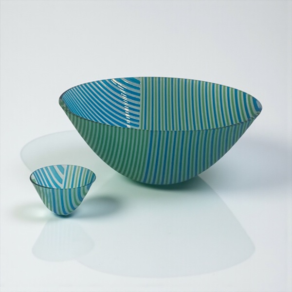 all my bowls are created by droping or sagging. A melted glass plate installed on a drop ring melts through and gives the shape to the bowl. A lot of coldworking is then needed: cutting off the rim, grinding and polishing. Mostly all bowls are sandblasted inside and outside. Every piece is unique. I use a lot of techniques to create my patterns, so my bowls got their name due to the technique.