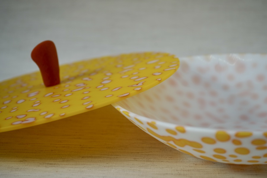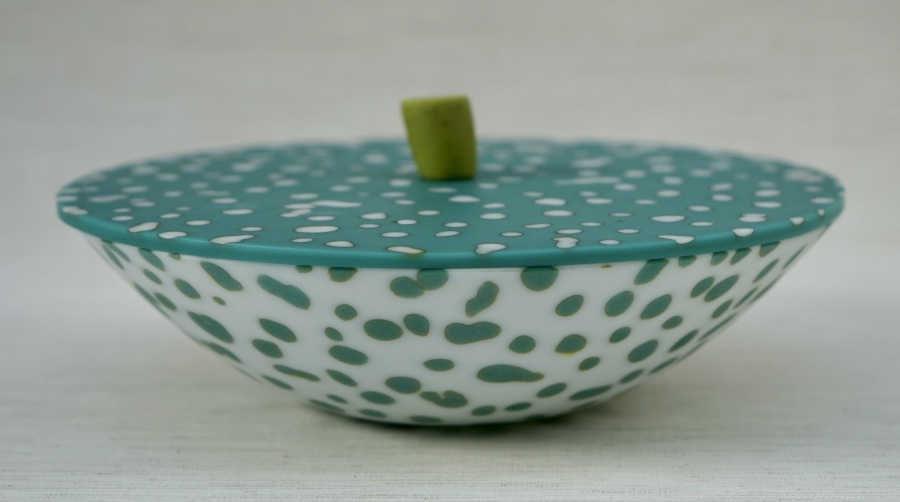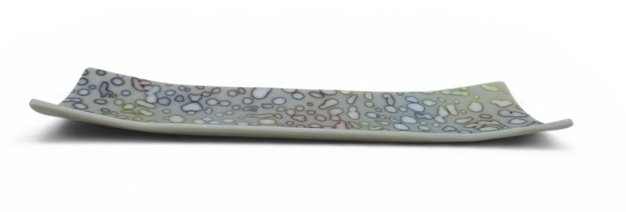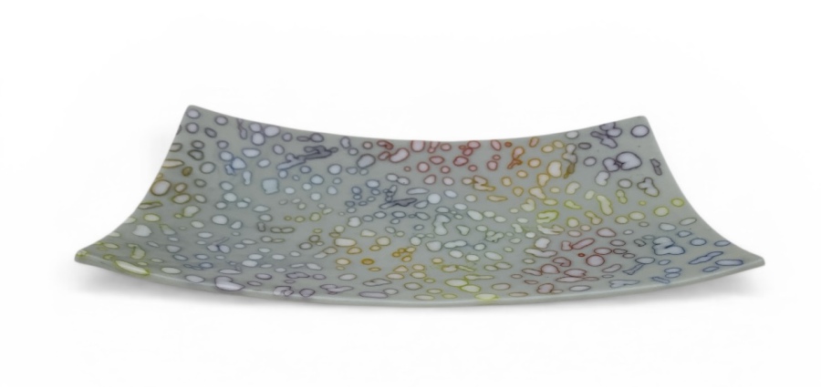 new collection 2026 for bowls, plates and glass art pieces, made of color full opaque sheet glass added with glass powder dots ….. just watch as well the nice small dramatic shadow around the pebbles !!