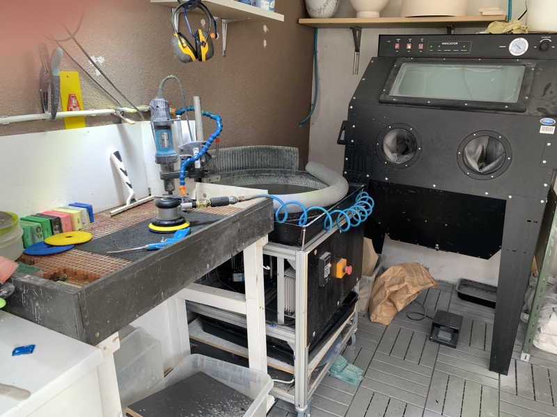 my cosy studio mesures about 30 square meters, composed of 2 parts: working space with large Nabertherm kiln and coldworking place with grinder, sandblaster, saw and wet space.